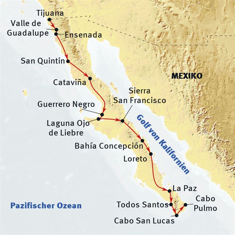 Abgabe des Mietwagens am Flughafen San José del Cabo (SJD). Individuelle Weiterreise in Eigenregie.Unser Tourvorschlag ist im wortwörtlichen Sinn ein Vorschlag. Der dargestellte Verlauf beruht auf langjähriger Veranstalter-Erfahrung, kann aber jederzeit Ihren persönlichen Wünschen und Bedürfnissen angepasst werden. Wir schneidern die Reise maßgerecht auf Ihre individuellen Reisewünsche zu.Verpflegung: F